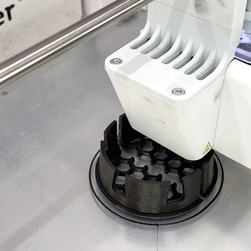 Armed with this knowledge, I went back to my computer and didn't touch the project for a while. Luckily, I had recorded the measurements in a file so when I restarted my model from scratch I didn't have to remeasure the stand. Starting with the hole radius in the rear and projecting upward at the 4-degree angle we measured on the Contura. The rest of the model came together smoothly, having been designed once before. After living with this upgraded cable management situation for a little while, I decided that my two side monitors needed some attention as well. I wanted a different design, one that was visually more interesting. After watching a few tutorials on YouTube I settled on a hexagon pattern for the front while keeping the rest of the design largely the same. When choosing a color to print in, I chose black specifically so that it would blend in better with the stand. I am very pleased with the results. After being pressed together the parts fit together very well to create the illusion of being one solid piece. To finalize the set I printed another of the hexagon caps and a cable guide in black. I think I can finally consider my cables managed, at least above the desk.