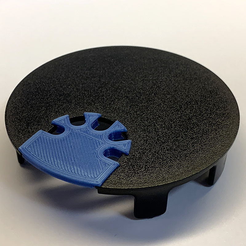 My original plans called for making an entire replacement cap but my early models showed that to be a pretty big waste of space. Since the root problem was that the cables were too small for the existing hole, rather than that I didn't have enough room, I decided to make an insert instead. Transferring the measurements from the existing cap into Fusion 360 was a pretty simple process, though not terribly accurate because of the ruler I was using. From there I modeled a part that would fill the hole, with some overlap and designed the 5 holes as smaller versions of the original passthrough hole.