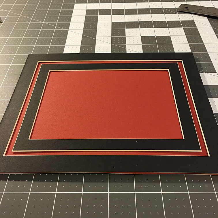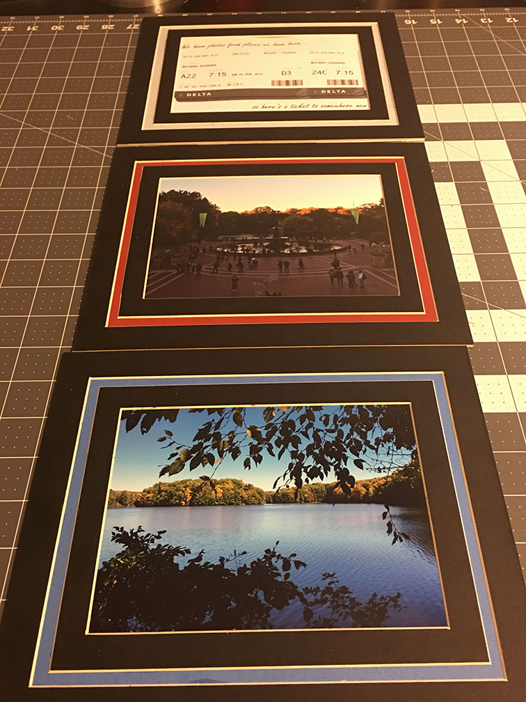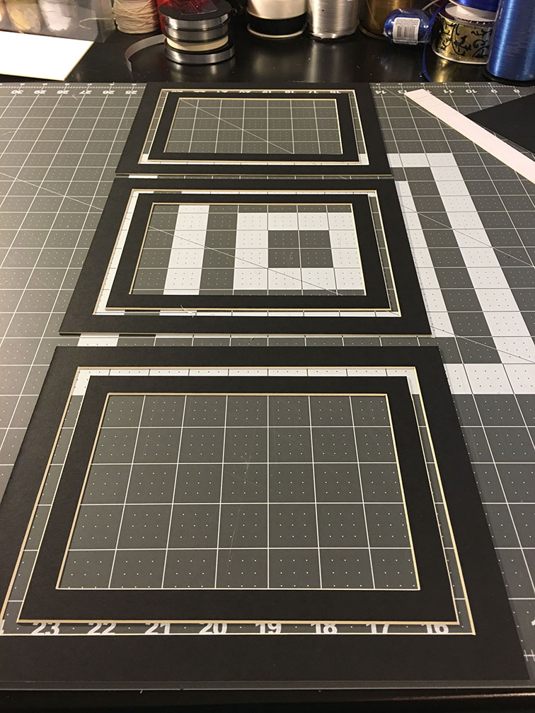 Once I had my design, I printed my digital photos at Costco and returned to the art store where I bought my mat cutter years earlier. Picking up some large pieces of matboard in a few different colors, I went home and set to work. I have found mat cutting to mostly be about patience, careful transfer of guidelines to the back of the mat, and a sharp cutter. In this project, my black mat actually ended up being the most complicated. Since I was making multiple mats I laid out a basic grid of my finished sizes, to be cut with a regular X-acto hobby knife. Then I laid out my internal cut lines for my mat cutter. The hardest part here is remembering which way the bevels are meant to go. Working from the back of the board means that the cut happens on the inner dimension. For a traditional mat, you are always lining up the straight edge on the mat portion of the mat and cutting from the window side. My mat was a little more complex, with a traditional window cut in the center, and then facing bevels where the mat would reveal the mat below. Taking no chances I drew little arrows to remind me which way the cuts were meant to go, which totally saved me a time or two.