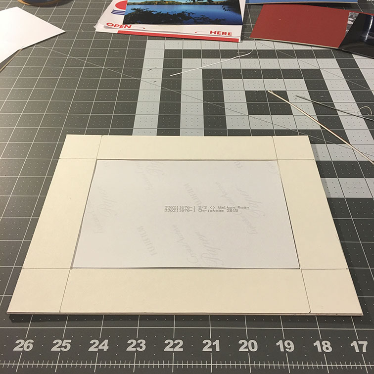 In all honesty, the rest was pretty straight forward. I cut my colored stock to size, removing a 5" x 7" opening in the back to accept the photo. I kept the piece that was cut out to provide a backing for the photo once it was put in place. To keep the pieces of matboard secured to each other I used a two-surface application of rubber cement. If you haven't read this project yet, applying rubber cement to both glue surfaces and then waiting until the glue is mostly dry before putting the pieces together provides a very strong bond. Any glue that squeezes out can usually be cleaned up with a little friction or a white eraser.