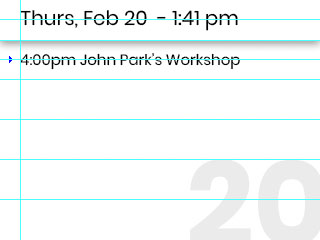 Heading over to Photoshop, I laid out a mockup of what I wanted the calendar to look like. Once my design was ready, I used the various examples that Adafruit supplies in their learn guide system to learn enough of DisplayIO to build my framework. The screen is broken down into a title bar to hold the date and time, a large text area to hold just the large number representing the date, and then a number of "rows" to hold the actual appointment information. Each row has a placeholder for the arrow indicating that the event is active and a text block. After the calendar data is downloaded to the PyPortal, the program can step through each appointment and populate the grid. Since the number of events may go down, either when the date changes or when an event is removed from the calendar, a small piece of code has to go through and clear unused cells. Because I need to update the time, as well as whether or not any events are currently active, the screen refreshes every 30 seconds. Because the calendar does not change that often, new data is downloaded every 10 minutes, cutting down on the amount of processing needed. As each event is loaded into its row, a quick check of current time against the start and end time of the event determines if the active event indicator should be shown or not... and that's it!