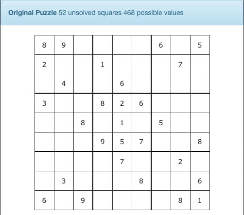 In 2015, I was helping some of our student employees to learn PHP. While they were working on learning the fundamentals of recursion with a maze solver, I was looking for a project of my own. As I sometimes use sudoku as a way to keep my mind engaged while I mull over problems I decided to create a solver. Part way into the project the prime minister of Singapore, Lee Hsien Loong, received recognition for posting his C++ code to solve sudoku puzzles (BBC link). Although I glanced at his code, I had already decided to work through the problem on my own.