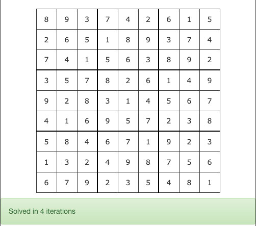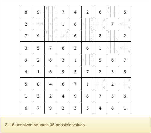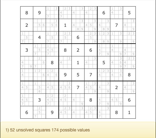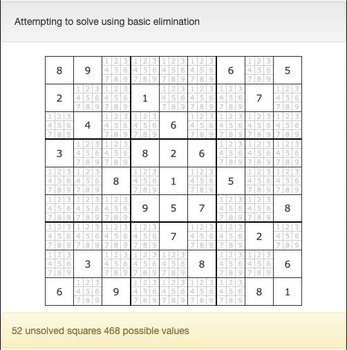I have to be honest here, the program was probably limited by my own ability to solve the more difficult puzzles, but it works very well on easy and medium difficulty puzzles. The core idea is that unless a value is predetermined, each square has nine potential values. Most easy puzzles are solvable by simple elimination. If a value is already in the same row, column, or sector, it can no longer be a possibility for that square. Once there is only one possibility, that value becomes fixed and the process continues until all squares are fixed. As I said though, this only works for the easier puzzles. Although this same elimination strategy helps with more complex puzzles, a new method is needed. In this mode, the solver looks also at the intersection of possibilities. If you remember your set theory from math... well, then you have a better memory than me. The idea is that it rather than just looking for values that are already used, it now looks for values that can only exist in one location. If a square can be 1, 2 or 3 and no other square has the possibility of being a 3, then that square must be 3. By combining these two methods the solver can now solve many more puzzles. The problem is that for some puzzles, even that is not enough, and for that, the only solution I could find was to use brute force.